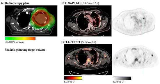 - Trigonis, I.; Koh, P.K.; Taylor, B.; Tamal, M.; Ryder, D.; Earl, M.; Anton-Rodriguez, J.; Haslett, K.; Young, H.; Faivre-Finn, C.; et al. Early reduction in tumour [18F]fluorothymidine (FLT) uptake in patients with non-small cell lung cancer (NSCLC) treated with radiotherapy alone. Eur. J. Nucl. Med. Mol. Imaging 2014, 41, 682–693. [Google Scholar] [CrossRef]