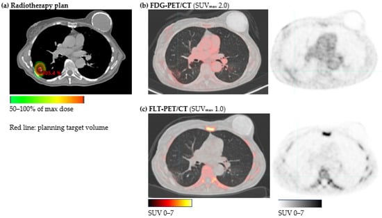 During and after radiotherapy, the FLT-uptake decreased more rapidly and more pronounced than the FDG-uptake in several cancers [9,10,11,12], including lung cancer [13,14,15,16]. With a higher specificity and better discrimination between inflammatory lesions and lung cancer [17], the FLT-uptake may reflect a relapse-status better than FDG-uptake. To our knowledge, post-radiotherapy FLT-PET-parameters have only been investigated in two studies: (1) After stereotactic body radiotherapy (SBRT), FLT-SUVmax was higher in recurrent lesions than in non-recurrent lesions in a study with 10 patients [18]. (2) After carbon-ion radiotherapy, FLT-SUVmax was not significantly different in recurrent and non-recurrent lesions in a study of 19 patients [19].