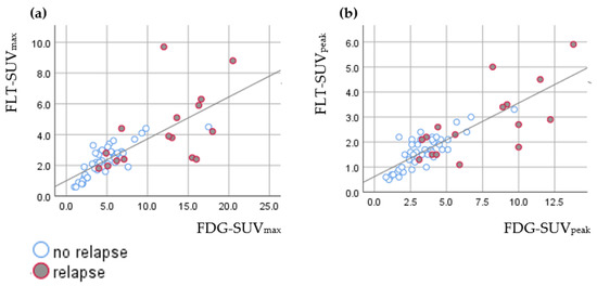 Correlation of (a) FDG-SUVmax and FLT-SUVmax with linear fit (R = 0.804; p < 0.001; spearman’s correlation), and (b) FDG-SUVpeak and FLT-SUVpeak with linear fit (R = 0.770; p < 0.001; spearman’s correlation).