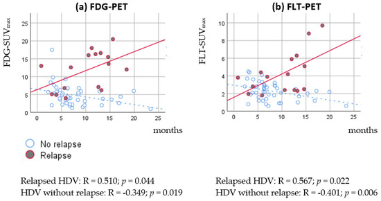 Scatter plot of SUVmax in HDV vs. time from the end of radiotherapy to the suspicion of relapse with a linear fit stratified by the relapse status. (a) FDG-SUVmax; (b) FLT-SUVmax.