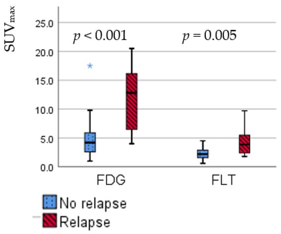 The HDV with relapse had a significantly higher SUVmax compared with non-relapsed HDV (median FDG-SUVmax: 12.8 vs. 4.2; p < 0.001; median FLT-SUVmax 3.9 vs. 2.2; p = 0.005), as illustrated in Figure 5. FDG-SUVpeak and FLT-SUVpeak showed similar results (median FDG-SUVpeak: 7.1 vs. 3.2; p < 0.001; median FLT-SUVpeak: 2.5 vs. 1.6; p = 0.005).