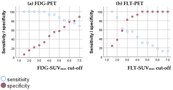 Scatter plot of sensitivity and specificity of FDG-SUVmax (a) and FLT-SUVmax (b) in HDV with variable cutoffs.