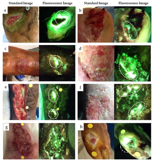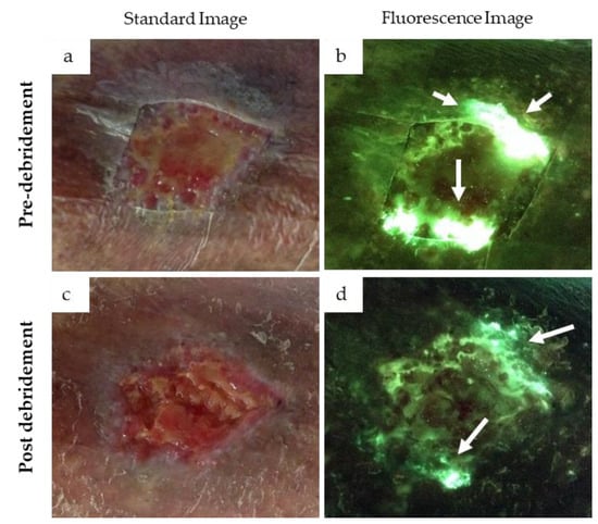 - Cole, W.; Coe, S. Use of a bacterial fluorescence imaging system to target wound debridement and accelerate healing: A pilot study. J. Wound Care 2020, 29, S44–S52. [Google Scholar] [CrossRef]