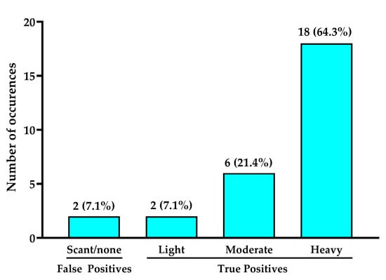 Total bacteria load quantified via semi-quantitative culture analysis from sampled regions of cyan fluorescence. Numbers on top of bars indicate number of study wounds in each category. Wounds where light to heavy bacterial loads were identified were considered true positives. In one wound, cyan fluorescence was observed but microbiological analysis did not detect bacterial load, thus it was considered a false positive.