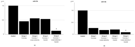Relative expression of miR-27b and miR-146 according to the systemic extent of atherosclerosis in different territories. The mean relative expression levels of (a) miR-27b and (b) miR-146 are presented using the Livak method (2−ΔΔCt), with lower values corresponding to lower expression levels [24]. * p-value < 0.05 vs. controls.