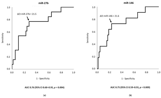 The expression levels (ΔCt) of miR-27b and miR-146 differed across groups (ANOVA p < 0.05 for both miRNAs; Table 2), whereas the expression levels of other miRNAs did not.