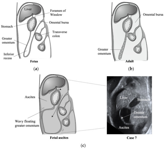 We considered that the finding of a floating greater omentum in ascites is associated with omentum development during the fetal period. The greater omentum forms in the 12th week of gestation [10]. The omentum is a folded double layer of peritoneum connecting to the gastric greater curvature, and the omental bursa reaches as low as the free margin of the greater omentum, which is described as an inferior recess (Figure 2a). During fetal development, the dorsal mesentery of the transverse colon and dorsal part of the mesogastrium fuse to become the transverse mesocolon. The inferior recess is obliterated by fusion of the anterior and posterior sheet of the greater omentum, forming the lower border of the omental bursa [10,11]. In adults, the vertical extent of the omental bursa is limited due to the fusion of the greater omentum (Figure 2b), and only the omental bursa can be identified in ascites [11]. During the fetal period, a large amount of ascites fluid will flow into the inferior recess of the omental bursa through the foramen of Winslow, and a floating greater omentum in ascites can be demonstrated (Figure 2c).