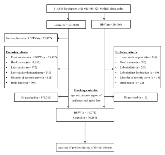 We hypothesized that thyroid disorders, including autoimmune thyroiditis and hyperthyroidism, could affect the occurrence of BPPV. To test this hypothesis, the previous histories of thyroid disorders, including goiter, hypothyroidism, thyroiditis, hyperthyroidism, and autoimmune thyroiditis, were analyzed in the BPPV patients compared to control participants adjusting for levothyroxine medication history.