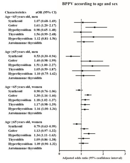 Thyroid diseases such as goiter, hypothyroidism, thyroiditis, and hyperthyroidism were related to BPPV in the present study. Both hyper- and hypothyroidism were associated with BPPV. On the other hand, autoimmune thyroiditis did not reveal a statistically significant association with BPPV. According to age and sex, the young women (<65 years old) subgroup showed a higher number of thyroid diseases (goiter, hypothyroidism, and hyperthyroidism) related to BPPV. Although a few prior studies suggested the association of autoimmune thyroiditis with BPPV [20,33] to the best of our knowledge, only a few previous studies have investigated the association of other thyroid diseases with BPPV.