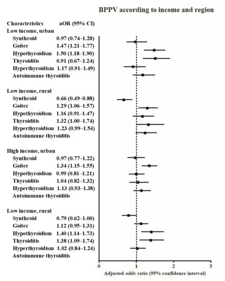 According to the income and region of residence, the history of goiter was positively related with BPPV in all subgroups except for high income, rural subgroup (Figure 3 and Table S3). The history of hypothyroidism was positively associated with BPPV in the low income, urban subgroup, and high income, rural subgroup. The history of thyroiditis was positively associated with BPPV in the high income, rural subgroup.