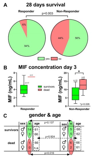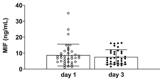 - Pohl, J.; Hendgen-Cotta, U.B.; Stock, P.; Luedike, P.; Rassaf, T. Elevated MIF-2 levels predict mortality in critically ill patients. J. Crit. Care 2017, 40, 52–57. [Google Scholar] [CrossRef]