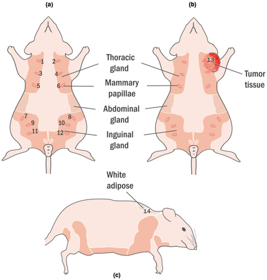 Healthy and tumor-bearing rats have been demonstrated. (a) Healthy rats are shown in the frontal plane with marked 12 nipples. The locations of the nipples are in the region of thoracic and inguinal. (b) The rat with tumor is shown in the frontal plane and tumor was marked with 13. The tumor according to the mammary tissues was formed around the 2nd and 4th tissue. (c) The healthy rat was shown in the sagittal plane. The white adipose, located on the nape, is marked 14.