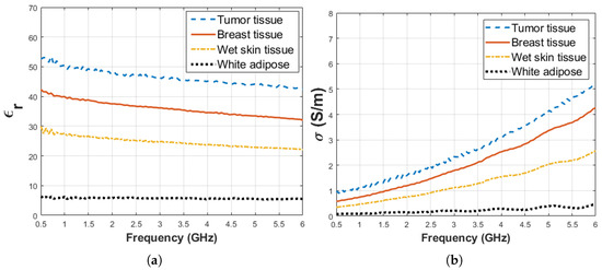 Median dielectric property measurement results between 0.5 and 6 GHz collected from various rat tissues including tumor, breast, skin, white adipose tissues: (a) relative permittivity and (b) conductivity.