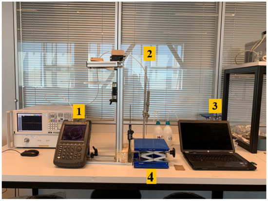 The experiment setup is composed of an Agilent FieldFox N9923A 6 GHz RF Vector Network Analyzer (VNA) (Santa Clara, CA, USA), Agilent Dielectric Slim Form open-ended coaxial probe (2.2 mm aperture diameter) (Santa Clara, CA, USA), Agilent 85070E dielectric property measurement software (Santa Clara, CA, USA), external computer, an adjustable stand, a digital caliper and two double-layered configuration samples. The setup is shown in Figure 4 and the function of each equipment is marked with 1 to 4 given in the figure: