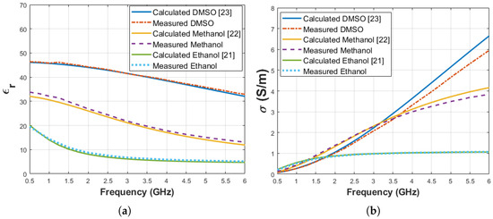 System validation was performed with three known materials: ethanol ( = 8.73 and = 0.86 S/m at 2 GHz), methanol ( = 26.86 and = 1.38 S/m at 2 GHz) and Dimethyl Sulfoxide (DMSO) ( = 44.23 and = 1.02 S/m at 2 GHz). The measurements were taken when the average temperature of materials was 28.3 ± 0.2 C. The measurement results were compared with calculated dielectric properties based on the Debye parameters from literature [21,22,23]. The temperatures of the materials were 29.5 C in the literature. The measured and calculated dielectric properties are shown in Figure 5. Also, maximum difference between measured and calculated dielectric properties from the Debye parameters given in the literature are listed in Table 2 at the corresponding frequency points.