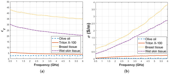 Before starting the experiment, dielectric property measurement was performed for pure materials; that is, triton X-100 and olive oil. Also, dielectric property measurements were collected from ex vivo rat tissues. Five measurements were taken for every sample and median of the measurement results are given in Figure 7a,b for relative permittivity and conductivity, respectively. The average temperature of pure materials was 27.5 ± 0.5 C. The standard deviation from the mean of five measurements for pure materials (olive oil, triton X-100, ex vivo breast and wet skin tissues) was calculated in the frequency range of 0.5–6 GHz with 101 points. The maximum standard deviations of dielectric properties are listed in Table 3 for each pure material at corresponding frequency points.