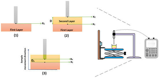Measurement protocol for analyzing sensing depth with double-layered sample configuration. (1) X position was determined based on the thickness of the first layer. (2) X position was determined based on the probe tip distance from the first layer (D) was calculated (X − X). (3) Double-layered sample configuration was gradually moved up to analyze the dielectric property change and sensing depth of the probe.