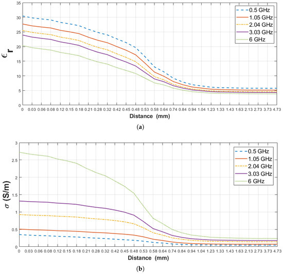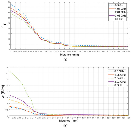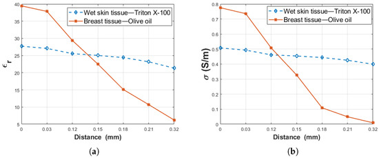 This study was performed to examine how various adnexal structures that can be formed on wet skin and around breast tissues can affect measurements. Moreover, two double-layered configurations were prepared to determine the effect of the dielectric property contrast between layers on the probe’s sensing depth. The first configuration was composed of rat breast tissue ( = 39.35 and = 0.8607 S/m at 1.05 GHz) and olive oil ( = 2.73 and = 0.0034 S/m at 1.05 GHz). In the second configuration, rat wet skin tissue ( = 26.86 and = 0.4812 S/m at 1.05 GHz) and triton X-100 ( = 5.11 and = 0.0722 S/m at 1.05 GHz) were used. For the first configuration, the difference between the layers are 36.62 units for relative permittivity and 0.8573 S/m for conductivity. The difference between the layers for the second configuration are 21.75 units for the relative permittivity and 0.409 S/m for conductivity. From these results, the difference of relative permittivity between the layers decreased 40% in the second configuration. Similarly, the difference of conductivity was declined 52% in the second configuration. To analyze the impact of contrast between the layers, the dielectric property change of the two configurations was compared at the frequency point of 1.05 GHZ as given at Figure 12. The dielectric properties of both configurations were plotted in the distance range of 0–0.32 mm (D). Since the most important change was observed at the close proximity of the probe tip, the most precise increment was implemented at this interval even though manual measurements were performed. Therefore, the distances are only the same at this interval for both configurations. As seen in Figure 12, since rat breast tissue-olive oil has a larger dielectric property difference a significant change was observed between 0–0.32 mm, the rat wet skin tissue-triton X-100 shows a more gradual change due to the relatively smaller dielectric property difference between the layers. In [18], the dielectric property contrast between first and second layers of the double-layered configuration were examined independent of frequency, and similar results were also observed.