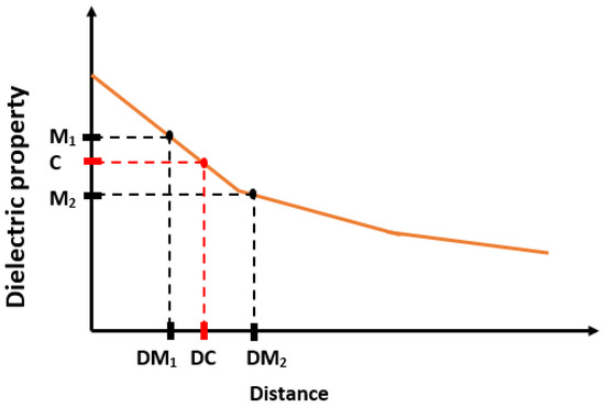 The distance (DC) was estimated for calculated dielectric property (C) based on percentage change using measured consecutive dielectric properties (M and M) and their distances (DM and DM).