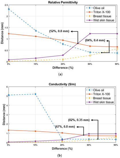 The probe tip distances from rat tissue layers (D) are shown as a function of five percentage change points in dielectric property of the materials used for double-layered configurations (olive oil, triton X-100, rat breast and wet skin tissue): (a) relative permittivity and (b) conductivity.