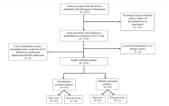 Increased glucose variability was associated with longer hospitalization and mortality in both nondiabetic and diabetic patients, as well as with in-hospital complications following surgery [7,8]. Hyperglycemia is not a common feature of overdose [9]. There is a wide range of studies about hyperglycemia in both medical, surgical, and intensive care unit (ICU) patients [9,10,11,12,13]. To our best knowledge, hyperglycemia due to poisoning has been studied only in acute intoxication with methanol and pesticides where it proved to be a prognostic factor for lethality [14,15,16,17]. We have not found any study on non-diabetic and diabetic patients following acute poisoning with undifferentiated xenobiotics to show multiple glycemic parameters with respect to poisoning severity score and outcome. In particular, the predictive value of multiple glycemic parameters for in-hospital mortality is unclear.