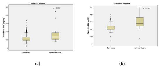 Box plot demonstrating the effect of admission blood glucose levels on mortality in patients without diabetes mellitus (a) and in patients with diabetes (b). Values are median and interquartile range; dots (°) represent outliers; * represent extreme values (shows non-normal distribution).