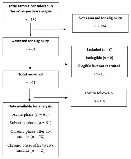 From the initial 61 subjects assessed during their acute stage (17.07 ± 13.21 days), 61 patients remained in the hospital during the subacute stage (107.06 ± 13.25 days), 58 in the chronic stage after six months (197.08 ± 13.25 days) and 42 patients after 12 months (382.06 ± 9.8 days; Figure 1), derived from the same individuals, which is also considered chronic stage, which is also considered chronic stage. The principal reason for subject loss in the study was discharge from the facility.