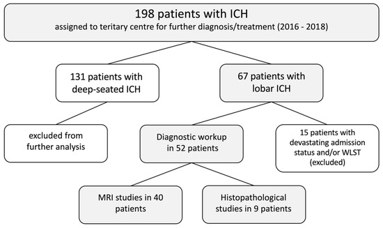 The present study was designed in order to investigate potential underlying pathologies in patients suffering from lobar ICH. Therefore, 198 eligible patients with ICH were screened and only patients with lobar ICH were included in further analysis. Patients suffering from non-lobar, deep-seated ICH were excluded. In addition, all patients with cerebellar ICH were excluded. Details are given in Figure 1.