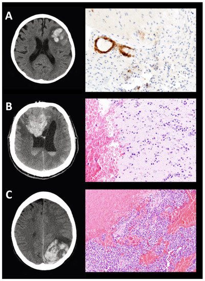 In 9 out of 52 patients (17%) suffering from spontaneous lobar ICH, further histopathological investigation was performed after surgical biopsy or evacuation of ICH (see exemplary case studies in Figure 3).