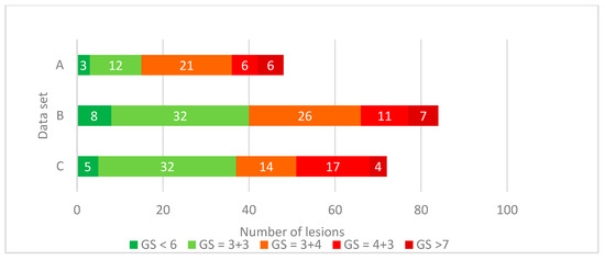 Distribution of Gleason grading of identified lesions at radical prostatectomy specimen of three different centers. The number of lesions per group is shown in white.