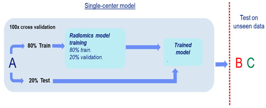 To assess the generalizability of our radiomics models, we used the experimental setup as shown in Figure 2. Image data from a single center was used to train a radiomics classifier for each center. On this training set, an 100× internal random-split cross-validation was used to assess the single center performance. Finally, the model was evaluated using the other two sets to assess the generalizability; this procedure was repeated with each set. The details regarding the development of the radiomics classifiers are explained in the following section.