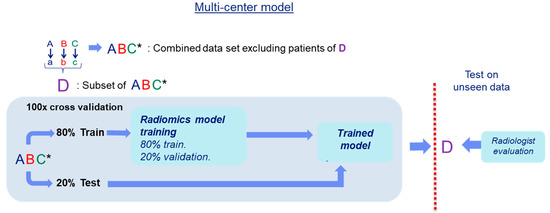 Scheme of the comparison experiment of our multi-center radiomics model with the evaluation by the radiologist. A randomly selected set of patients in ABC was set apart as test set (D), the rest of the data (ABC*) was used to develop the multi-center radiomics model.