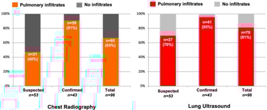 Chest X-ray and Lung Ultrasound for Detection of Pulmonary Infiltrates. The number of suspected or confirmed COVID-19 subjects (n) with or without pulmonary infiltrates detected by chest X-ray or lung ultrasound is demonstrated. In both suspected and confirmed COVID-19 subjects, lung ultrasound was able to detect pulmonary infiltrates more often than chest radiography.