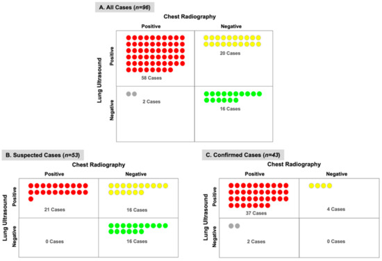 Correlation of Chest X-ray and Lung Ultrasound in Detection of Pulmonary Infiltrates. The number of subjects (n) and agreement between chest X-ray and lung ultrasound is shown for (A) all cases, (B) suspected COVID-19 cases, and (C) confirmed COVID-19 cases. Lung ultrasound detected pulmonary infiltrates in 20 subjects with a normal chest X-ray, whereas chest X-ray detected pulmonary infiltrates in 2 subjects with a normal LUS exam.