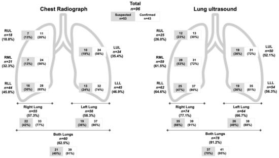 The distribution of pulmonary infiltrates detected by LUS versus CXR in suspected and confirmed COVID-19 subjects is shown in Figure 5 (Tables S1 and S2). LUS detected pulmonary infiltrates compared to CXR in a greater proportion of subjects in both the right (77% vs. 57%) and left lungs (67% vs. 58%). Regarding specific lung lobes, LUS detected pulmonary infiltrates more often than CXR in all lung lobes with the greatest differences in the right middle lobe (62% vs. 32%), right lower lobe (65% vs. 46%), and left upper lobe (52% vs. 35%). In all lung lobes, pulmonary infiltrates were detected more frequently in confirmed versus suspected COVID-19 subjects by either LUS or CXR.