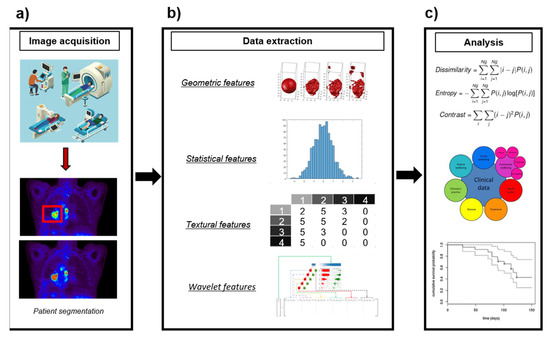 In this context, non-invasive imaging techniques, such as magnetic resonance (MR), computed tomography (CT) and positron emission tomography (PET) become relevant due to their ability to provide information on the whole tumor in one acquisition [13]. Nowadays, imaging is central to cancer management, having applications in screening, diagnosis, staging, prognosis and treatment response, among other things [14,15,16,17,18]. Mainly, PET has emerged as the predominant imaging modality, overperforming conventional imaging techniques for the evaluation of blood [19], head and neck [20] or lung cancer [21]; and it has been increasingly proposed as an ideal tool for characterizing the biology of tumors at the macroscopic scale [13,22,23,24,25]. Over the last years, there has been an increasing interest in extracting quantitative information from PET images using image analysis [26,27]. Thus, semi-quantitative parameters such as the standard uptake value (SUV), the metabolic tumor volume (MTV) or the total lesion glycolysis (TLG) [28] obtained from 18F-fluorodeoxyglucose PET (FDG-PET) images, have been demonstrated to provide relatively objective information useful for the diagnosis, earlier evaluation and monitoring of treatment response [24,25,28]. These parameters are now fully incorporated into clinical guidelines and commonly measured at most hospitals in developed countries [29].