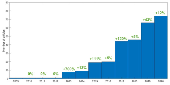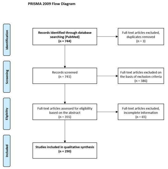The search process (Figure 2) returned a total of 744 publications. Three duplicated records were identified and removed. Titles and abstracts of the remaining 741 records were screened. After screening, we excluded 386 records due to inclusion/exclusion criteria. Full texts of the remaining 355 records were inspected. Sixty-five articles were excluded due to inclusion/exclusion criteria or incomplete information after a detailed assessment. Finally, a total of 290 full-text articles were included in the review. A complete list of the evaluated publications along with the data extracted from each publication can be found in the Supplementary Material Table S1. Using this selection, we corroborated the increasing pace of publications in PET radiomics in the later years. According to our findings, the first papers on PET radiomics appeared in 2009–2012 (one publication per year), and the number of publications started to rise after 2013 (eight publications), with nine publications in 2014 (+13% interannual increase), 19 in 2015 (+111% interannual increase), 20 in 2016 (+5% interannual increase), 44 in 2017 (+120% interannual increase), 46 in 2018 (+5% interannual increase), 66 in 2019 (+43% interannual increase), and 74 publications in 2020 (up to October 15) (+12% interannual increase) (Figure 3).