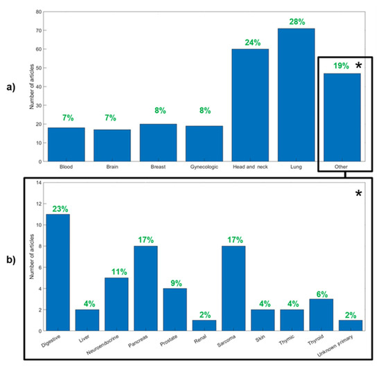 The number of articles associated with each cancer type group. (a) Number of patients per number of groups studied in the present review. (b) Distribution of cancer types in the “Other” group. In green, the percentage of publications corresponding to that group. * Percentages in panel (b) represent the percentage in the “Other” group.