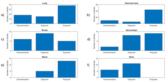 Figure 5. Studies targeting each of the defined objectives segmented by cancer type. (a) Lung, (b) head and neck, (c) breast, (d) gynecologic, (e) blood, (f) brain cancer. - Most of the studies presented average (60%) or good (32%) levels of validation, and only a small number of studies performed proper validation using independent cohorts (8%).