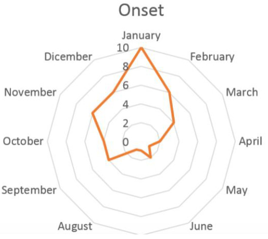 In a study of 40 paediatric headache patients with NDPH, precipitating events were noted in 88% of cases: febrile illness in 43%, preceding minor head injury in 23%, and cranial or extra cranial surgery in 10% [9]. Moreover, at paediatric age, chronic headaches often show a seasonal cyclical pattern, which has been related to school activities [10,11,12]. In paediatric NDPH, the hypothesis has been made that the onset can fall in the months when children start or return to school [4,11,13]. In our NDPH patients, stressful school activity was a frequently recognized trigger event (46% of patients). Indeed, a significant increase in NDPH onset was found in the months when students started school after summer break (September) or returned to school after winter break (January) (Figure 2).
