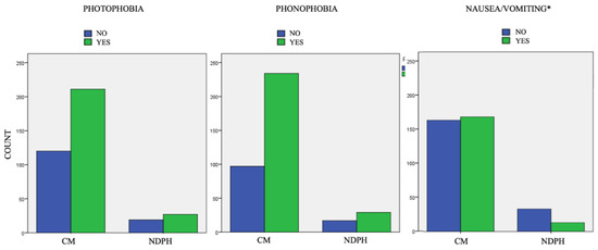 Regarding vegetative symptoms, NDPH patients experienced nausea and vomiting less often than CM patients (28.3% vs. 58%; p < 0.01).