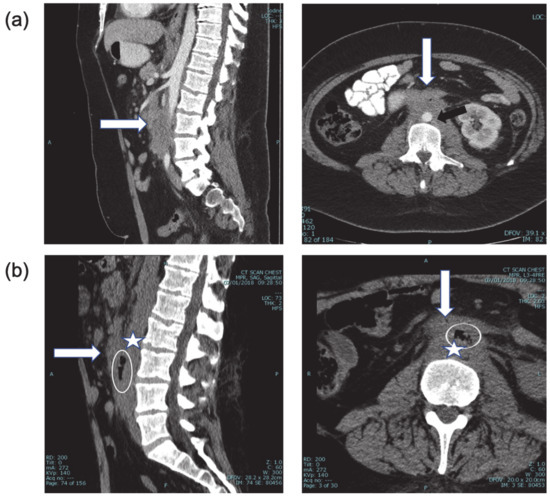 (a) CT + intravenous contrast, three months prior to bleeding event, showing the extent of disease (white arrow) around the abdominal aorta (black arrow) and relationship to duodenum (sagittal and axial views). (b) CT of the spine one month prior to bleeding. Sagittal and axial views. With retrospect, air (encircled) was identified between the aorta (star) and duodenum (arrow), highly suspicious for aorto-duodenal fistula.
