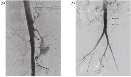 - Behrendt, C.-A.; Wipper, S.; Debus, S.E.; Von Kodolitsch, Y.; Püschel, K.; Kammal, M.; Kammal, A.; Information, R. Primary aorto-enteric fistula as a rare cause of massive gastrointestinal haemorrhage. Vasa 2017, 46, 425–430. [Google Scholar] [CrossRef] [PubMed]