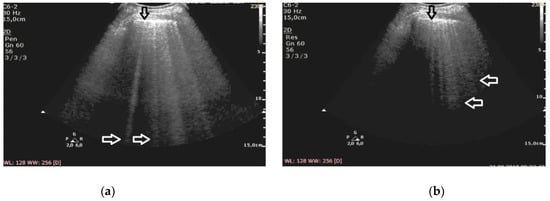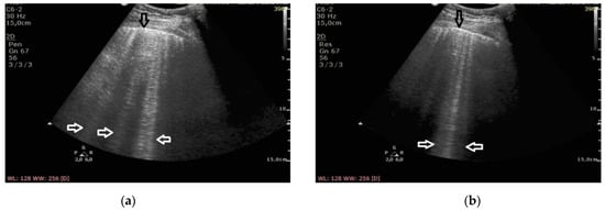 Cardiogenic pulmonary edema; (a) B-lines at 2 MHz (white arrows), regular pleural line (black arrow), (b) B-lines at 6 MHz (white arrow), regular pleural line (black arrow).