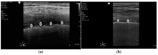 Linear transducer used for the evaluation of pleural line abnormalities: (a) irregular, blurred pleural line (white arrows), coarse in appearance, in pulmonary fibrosis; (b) regular pleural line, with preserved echogenicity (white arrows), in pulmonary edema.