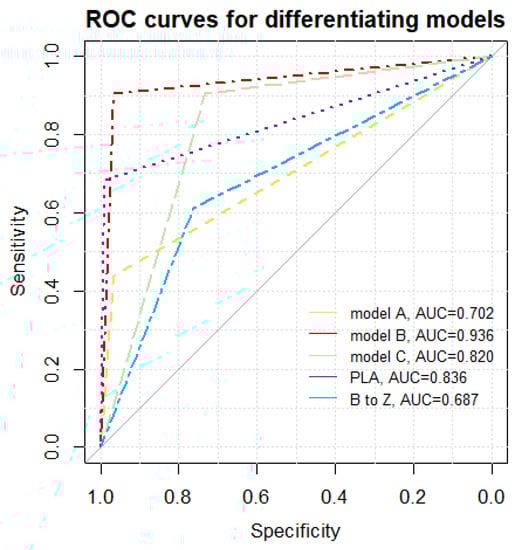 Receiver operating characteristic (ROC) curves for methods of differentiation between pulmonary fibrosis and pulmonary edema. The area under the curve for model B is significantly greater than for other models, with maximal p-value of 0.0033 (model B compared to PLA); PLA—pleural line abnormalities in a single examination zone, B to Z—Conversion of B-line artifacts to Z-line (with the frequency changed from 2 MHz to 6 MHz) in a single examination zone; model A—any conversion of vertical artifacts (B to Z, B to A, Z to A with the frequency changed from 2 MHz to 6 MHz) in 3 or more areas, and lack of consolidations, model B—any conversion of vertical artifacts (B to Z, B to A, Z to A with the frequency changed from 2 MHz to 6 MHz) in 3 or more areas, lack of consolidations, and PLA in at least 2 zones, model C—any conversion of vertical artifacts (B to Z, B to A, Z to A with the frequency changed from 2 MHz to 6 MHz) in 3 or more areas, and PLA in at least 2 zones. AUC—area under the curve.