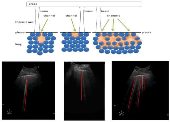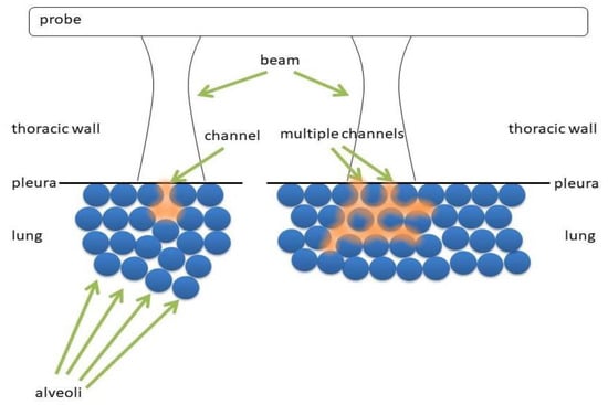 It has been suggested in a previous paper [11,12] that every vertical artifact which can be observed in a LUS image is probably generated by multiple reflections between the walls of the lung aerated spaces. It is highly unlikely that a vertical artifact can be generated by a vibrating air bubble (alveolus or an alveolus partially filled with water) [12]. An acoustic trap is needed to generate a vertical artifact: (a) an acoustic pulse is transmitted from the thoracic wall to the trap through a thickened interstitial space; (b) multiple reflections between the walls of the aerated spaces which surround the trap generate an acoustic perturbation inside the trap; (c) such an acoustic perturbation acts as an ultrasound source, and gradually re-radiates the trapped acoustic energy to the transducer [12,13]. Figure 6 shows two types of acoustic trap. The panel on the left shows a medium (water, blood, tissue, etc.) which is connected to the thoracic wall by means of a single channel. The panel on the right shows a more complex acoustic trap, which is formed by sparse media connected to the thoracic wall by means of multiple channels. In the first case, the aperture of the acoustic trap is given by a single channel, while in the second case by multiple channels.