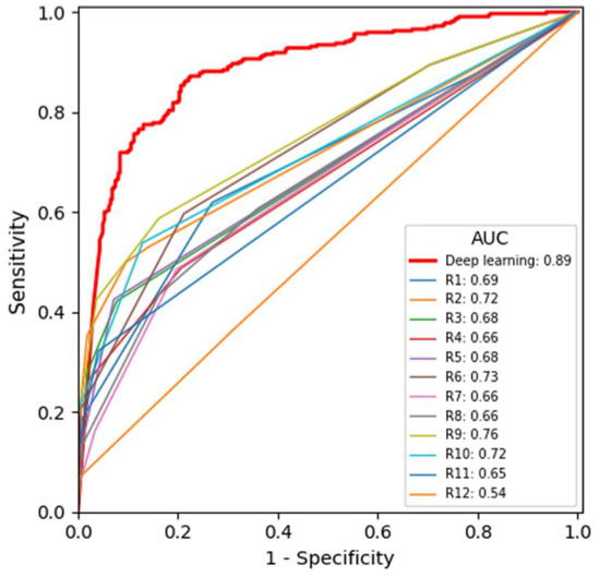 Receiver operating characteristic curves of the deep learning algorithm and the 12 radiologists. Radiologists R7–R12 are residents, whereas R1–R6 are attending radiologists. AUC = area under the curve.