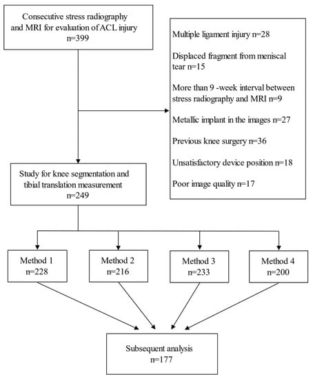 This section may be divided by subheadings. It should provide a concise and precise description of the experimental results, their interpretation, and the experimental conclusions that can be drawn. In the inclusive 249 patients, the successful numbers of knee segmentation and tibial translation measurement were 228, 216, 233, and 200 patients by methods one, two, three, and four, respectively, with successful rates ranging from 80.3% to 91.6%. Examples of unsuccessful cases are shown in Appendix A. The final data available for analysis were derived from the 177 patients (mean age ± standard deviation, 28.4 years ± 10.5, age range, 16–68 years) with successful measurements by all four methods. The patient characteristics of our study were summarized in Table 1. Among the 177 patients (144 males and 33 females), completely torn ACLs were found in 129 patients. The mean interval between stress radiography and MRI was 20.44 days.
