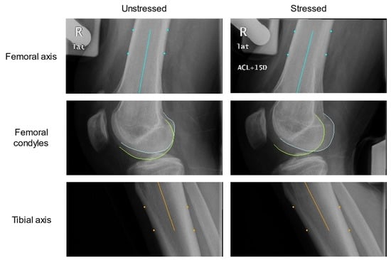 The clinical diagnosis of ACL tear is based on anterior tibial translation by applying a different force to the knee. The anterior drawer test is subjective, unmeasurable, and not well reproducible [3]. Stress radiography of the knee offers a relatively objective and measurable approach to quantify the anterior tibial translation when applying force to the knee [4,5,6,7]. A prior study has focused on the effect of knee position on the reproducibility of measurements taken from stress radiography [8]. A different knee flexion angle, injury extent, muscle guarding, and femoral rotation affect the laxity measurement using stress radiography [4,9,10]. Another study compared different measuring methods and assessed the intra-class correlation coefficient of each method to evaluate the knee instability [11]. However, the reliability of manual measurements done by different readers and different methods is questionable.